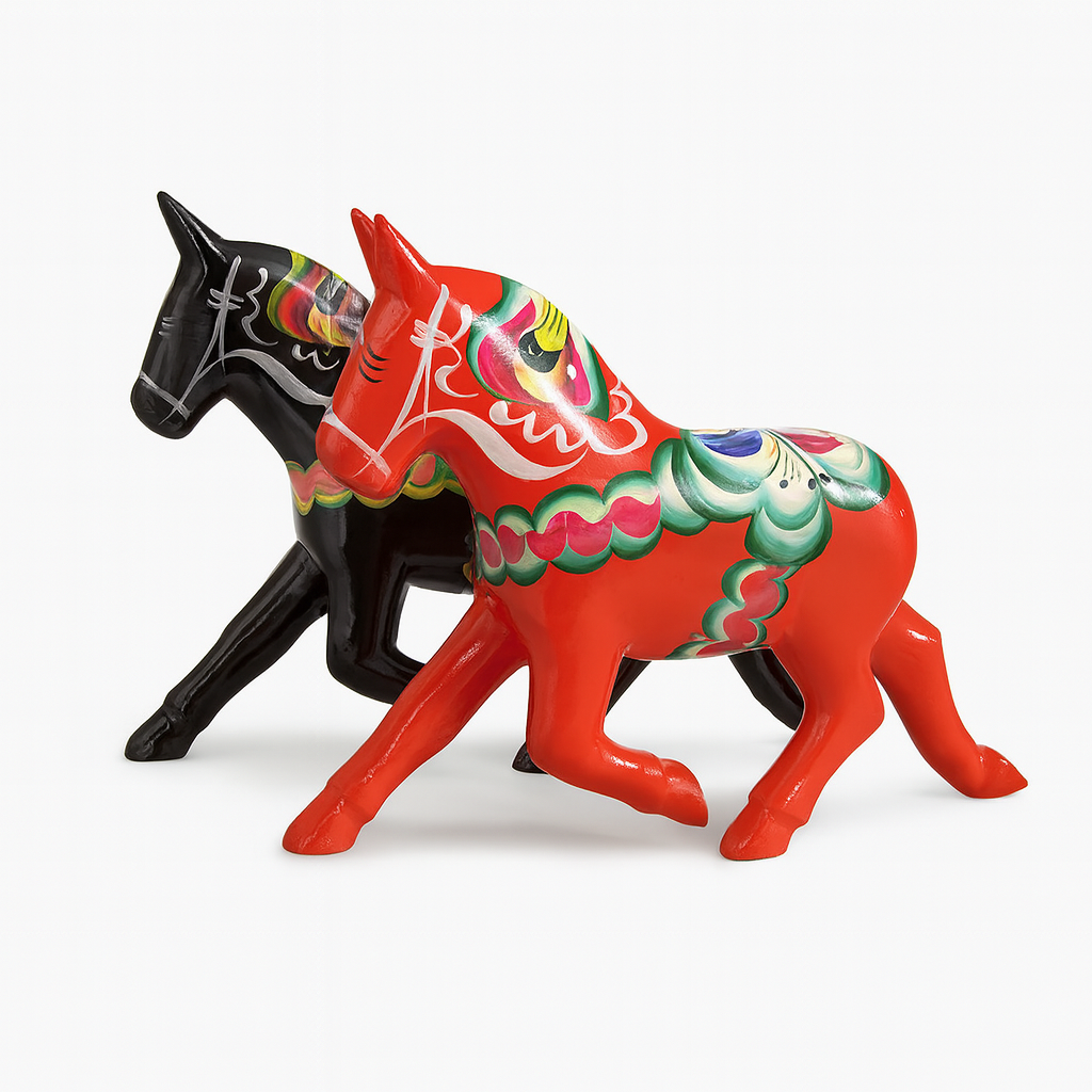 Exclusive Running Dala Horse, handmade and hand-painted in Sweden. Choose between 2 base colors: red and black. The earliest reference of wooden horses for sale is from 1624, nearly 400 years ago. Today, Dala horses are a true symbol of Sweden!